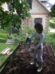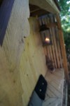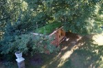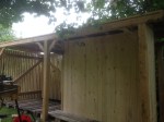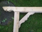 Dette brændeskur har, ligesom det forrige brændeskur og legehuset, heller ikke noget med det historiske ved huset at gøre. Men det får alligevel spalteplads. Udskæringerne, der er brugt i dette brændeskur er magen til udskæringerne i taget. Omend i et mindre målestoksforhold. Træet er tappet sammen og taget er ikke færdigudvokset endnu. (Men man kan fornemme pointen med det grønne tag). Dertil blev der er også plads til en lille siddeplads. Skuret rummer 6 rummeter brænde, bænk og skur til haveredskaberne.